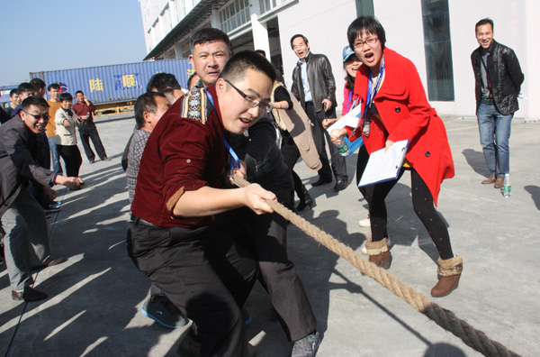 下午,一場別開生面的拔河比賽將活動推向小高潮。拔河比賽以促進企業(yè)交流為宗旨,豐富職工體育活動為目的,為企業(yè)搭建展現(xiàn)集體風采的舞臺,從而發(fā)揚團隊精神,增強凝聚力。此次比賽園區(qū)企業(yè)積極響應,共有11個企業(yè)組隊參加,特別是有些企業(yè)為了參賽,臨時停工,比賽結束后回單位繼續(xù)生產(chǎn),體現(xiàn)了園區(qū)大家庭的凝聚力。每支參賽隊伍共15人,其中男生10人,女生5人,實行淘汰制晉級方式。當比賽哨聲響起,各參賽隊員們口中一起高呼“一二,一二”,雙手緊握長繩,憋足勁拼命往后拉,拉拉隊在旁助陣加油,恨不得抓起繩子跟隊員們一起努力,各種加油聲、吶喊聲此起彼伏,回響至整個園區(qū)。經(jīng)過激烈較量,最終冠捷科技獲得冠軍,瑞達物業(yè)獲得亞軍。